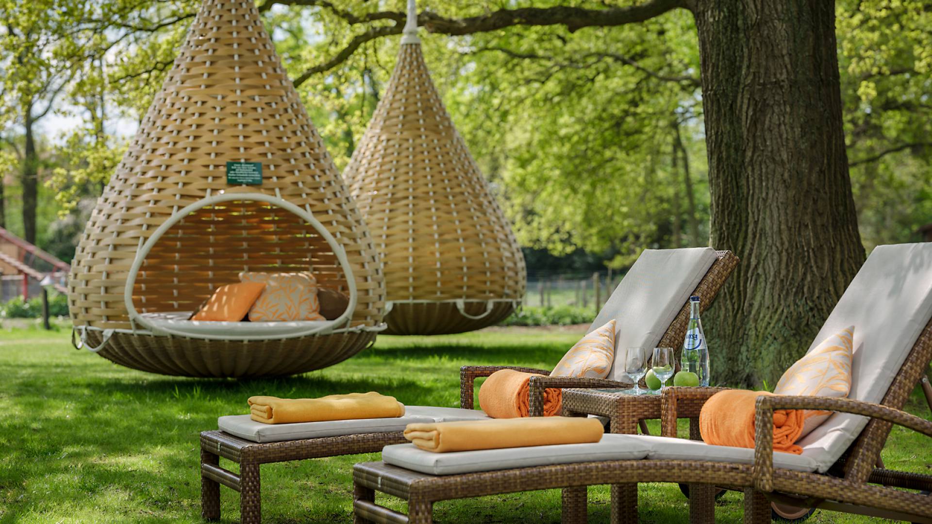 And outside you will find refuge in one of our beach chairs, on a lounger under our large oaks or in the sun, or from April to October in our tree nests.